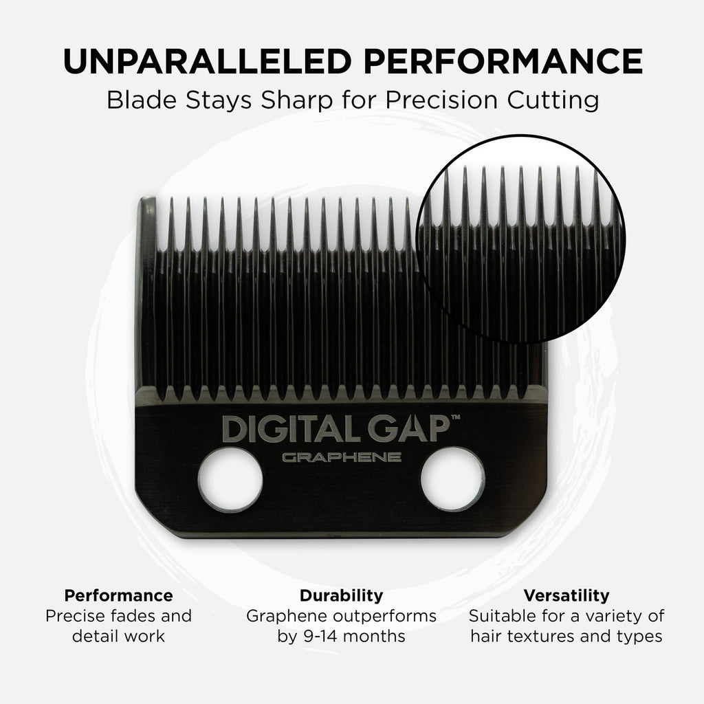 The Digital Gap™ Ambassador Graphene Taper Blade combines the precision of Digital Gap™ Technology with the exceptional properties of graphene, delivering a cooler, sharper, and longer-lasting grooming experience. With its high durability, reduced friction, and premium cutting performance, this blade is a game-changer for professional barbers looking for the ultimate tapering tool.